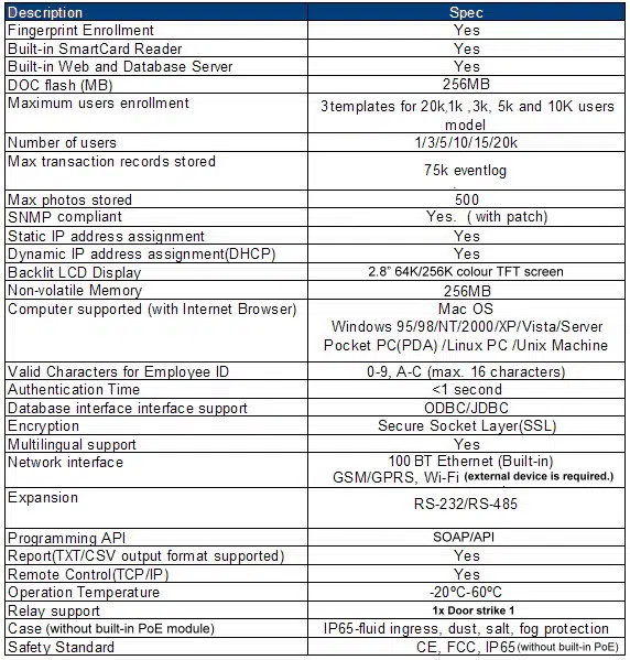 | FingerPrint Users capacity | 250,000(1:1)/20,000(1:N) | ||||||||||||